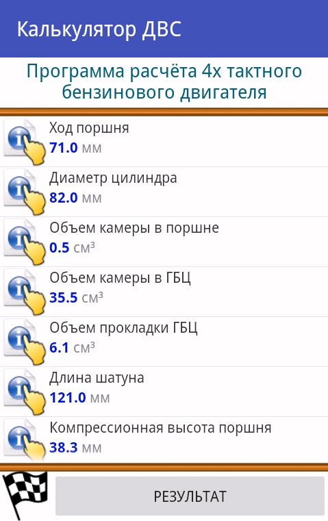 Благодаря данному приложению Вы можете рассчитать параметры своего ДВС:
